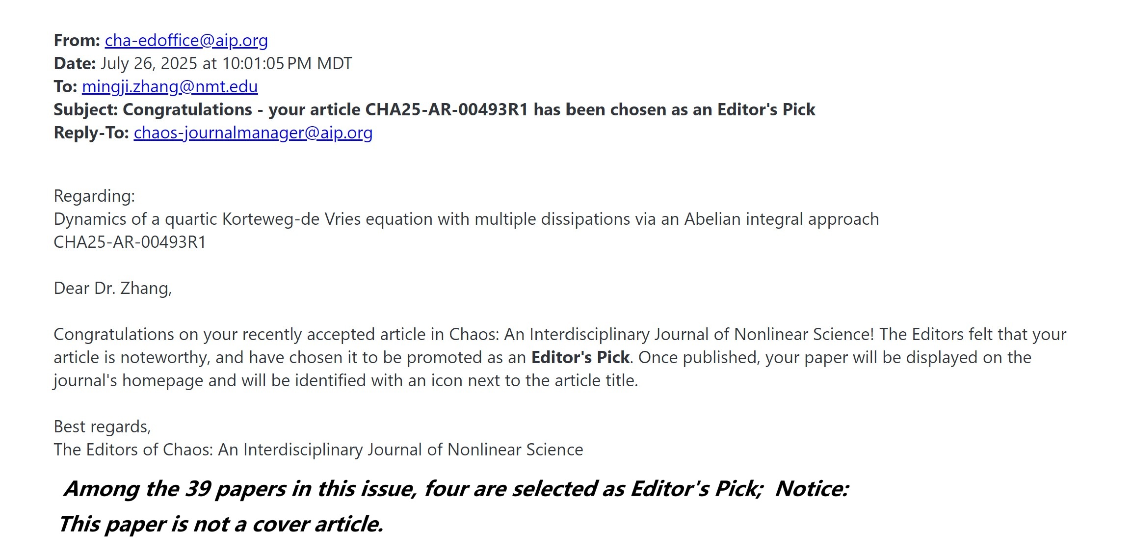 [3] Dynamics of a quartic Korteweg–de Vries equation with multiple dissipations via an Abelian integral approach, Chaos: An Interdisciplinary Journal of Nonlinear Science 35 (2025), 083113. (with M. Zhang). (Editor's Pick)