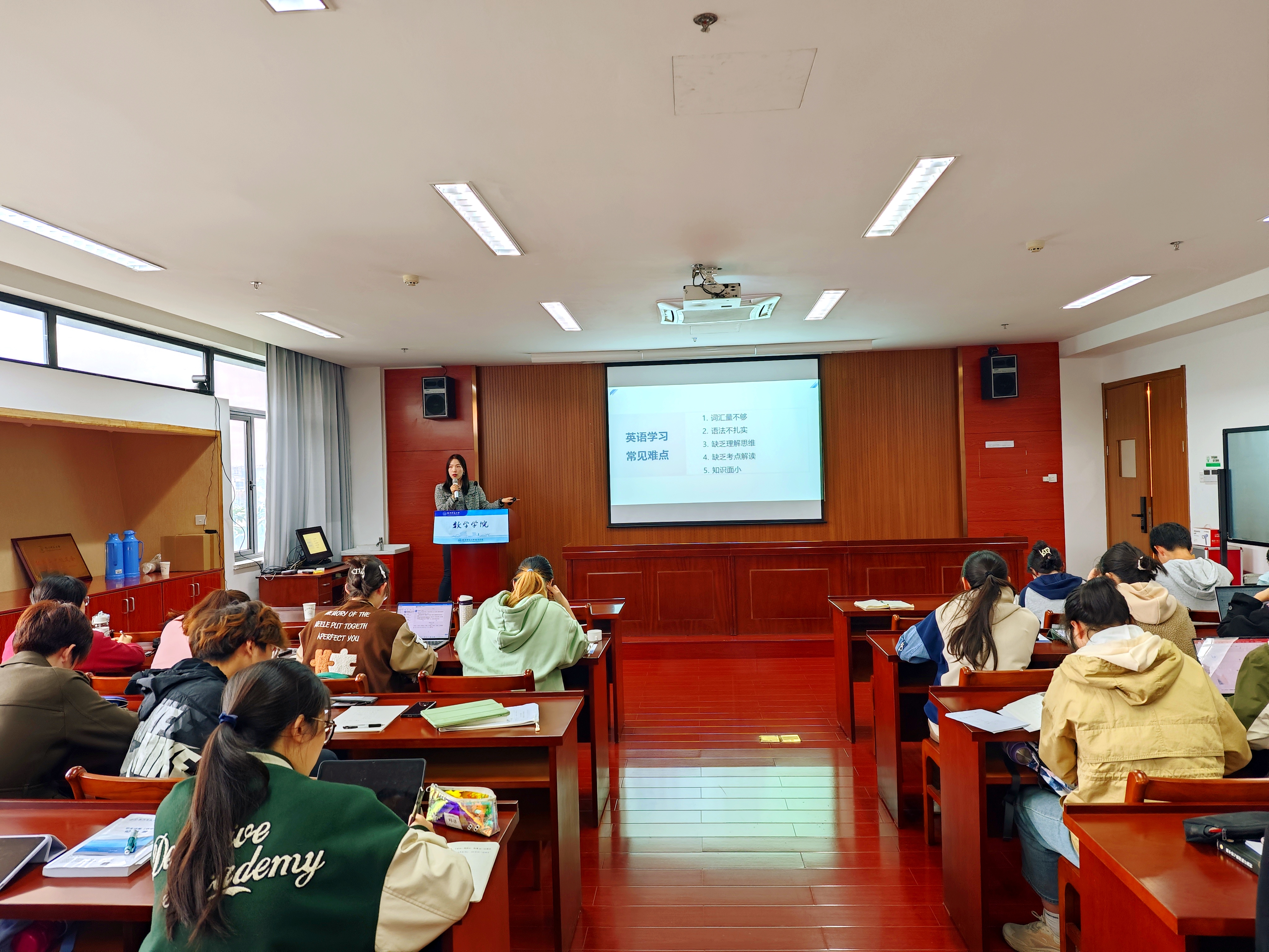 活动中,新通教育负责海外留学和雅思培训的专业老师分享了他们关于本科生留学和英语学习的一些心得。单老师从国内考研日益内卷、学历贬值的角度出发,向同学们阐述了留学的必要性、可能性和现实性,以及留学在学制、求职就业的独特优势,特别地,他结合数学专业的特点,就数学专业学生的可能留学专业进行了详细分析,为同学们日后留学提供了一种有益性参考。王老师从英语学习的角度出发,向同学们分享了关于英语学习的一些认识论和方法论层面的思考。她结合词汇记忆、听力练习、阅读理解、写作训练和口语对话等几个模块的重点、难点和痛点,以翔实的事例为依据,以科学的方法为指导,使现场的同学们获益匪浅。