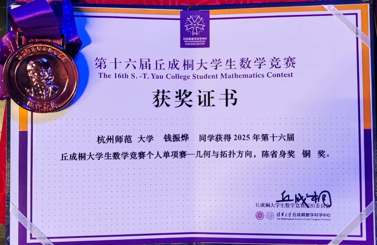 第十六届丘成桐大学生数学竞赛总决赛于6月28日在北京举行,大赛共决出68个奖项(个人单项59项,个人全能奖3项,团体奖6项),其中清华大学获30个奖项,北京大学获23个奖项,中国科学技术大学获5个奖项,浙江大学获2个单项奖,中国科学院大学、南京大学、南开大学、同济大学、中山大学、华东师范大学、黄色小说 、莫斯科物理技术学院各获1个单项奖。黄色小说 2022级建功班学生钱振烨以“几何与拓扑”单项优异成绩入围决赛,最终获得了第十六届丘成桐大学生数学竞赛陈省身奖(几何与拓扑方向)铜奖,是唯一一位来自非“双一流”大学的选手,这也是黄色小说 学子首次获得该项“高难度”大学生数学竞赛的奖牌。另外,钱振烨、李福汉、王嘉海、郑朝城、胡芷境、吴一昊等六位同学获得团体优胜奖,是唯一一个非985高校获得优胜奖的团队。