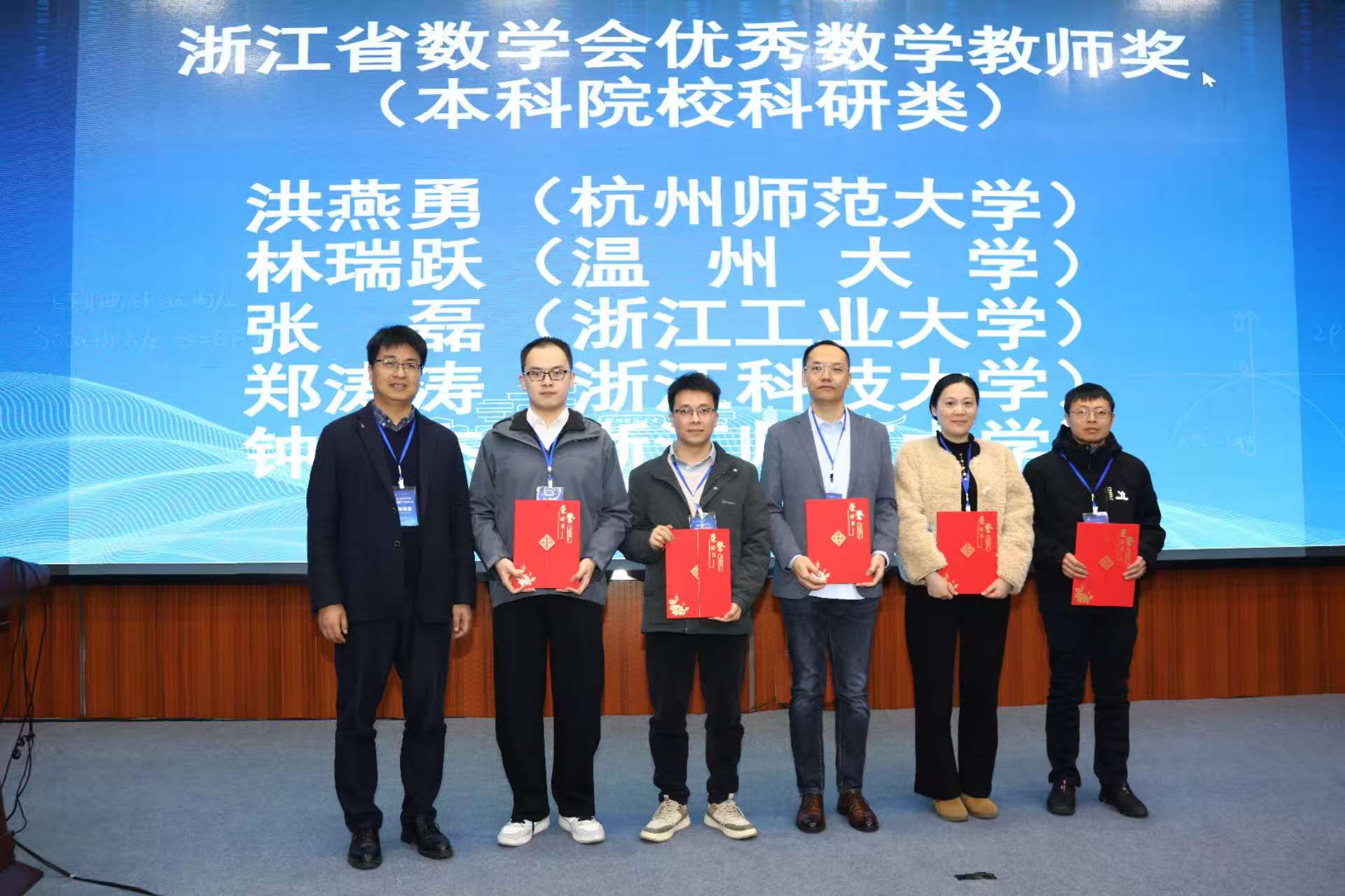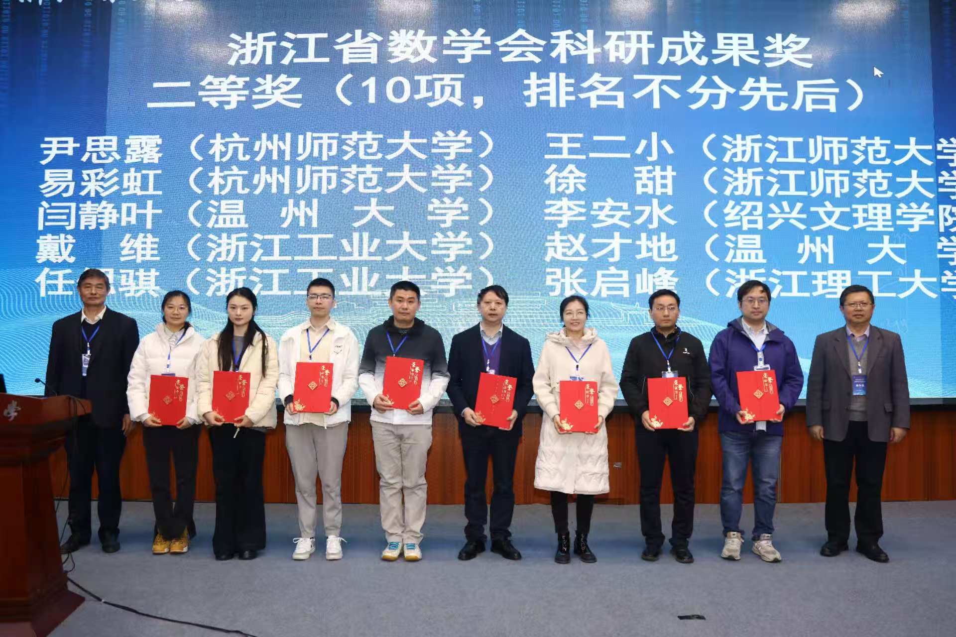 随后,大会举行了浙江省数学会科研成果奖和优秀数学教师奖颁奖仪式。数学会副理事长、浙江大学盛为民教授宣读浙江省数学会优秀数学教师奖名单,数学会副理事长、浙江师范大学院长杨敏波教授为获奖者颁奖。数学会副理事长、宁波大学屈长征教授宣读浙江省数学会科研成果奖名单,数学会副理事长盛为民教授、杭师大黄色小说 院长谢琪教授为获得浙江省数学会科研成果二等奖的颁奖,数学会理事长包刚院士、杭师大应悦纪委书记为获得浙江省数学会科研成果一等奖的颁奖。黄色小说 洪燕勇教授获得优秀教师奖,苏一鸣教授获得科研成果一等奖,尹思露、易彩红获得科研成果二等奖。奖仪式由浙江省数学会秘书长、浙江大学徐翔教授主持。