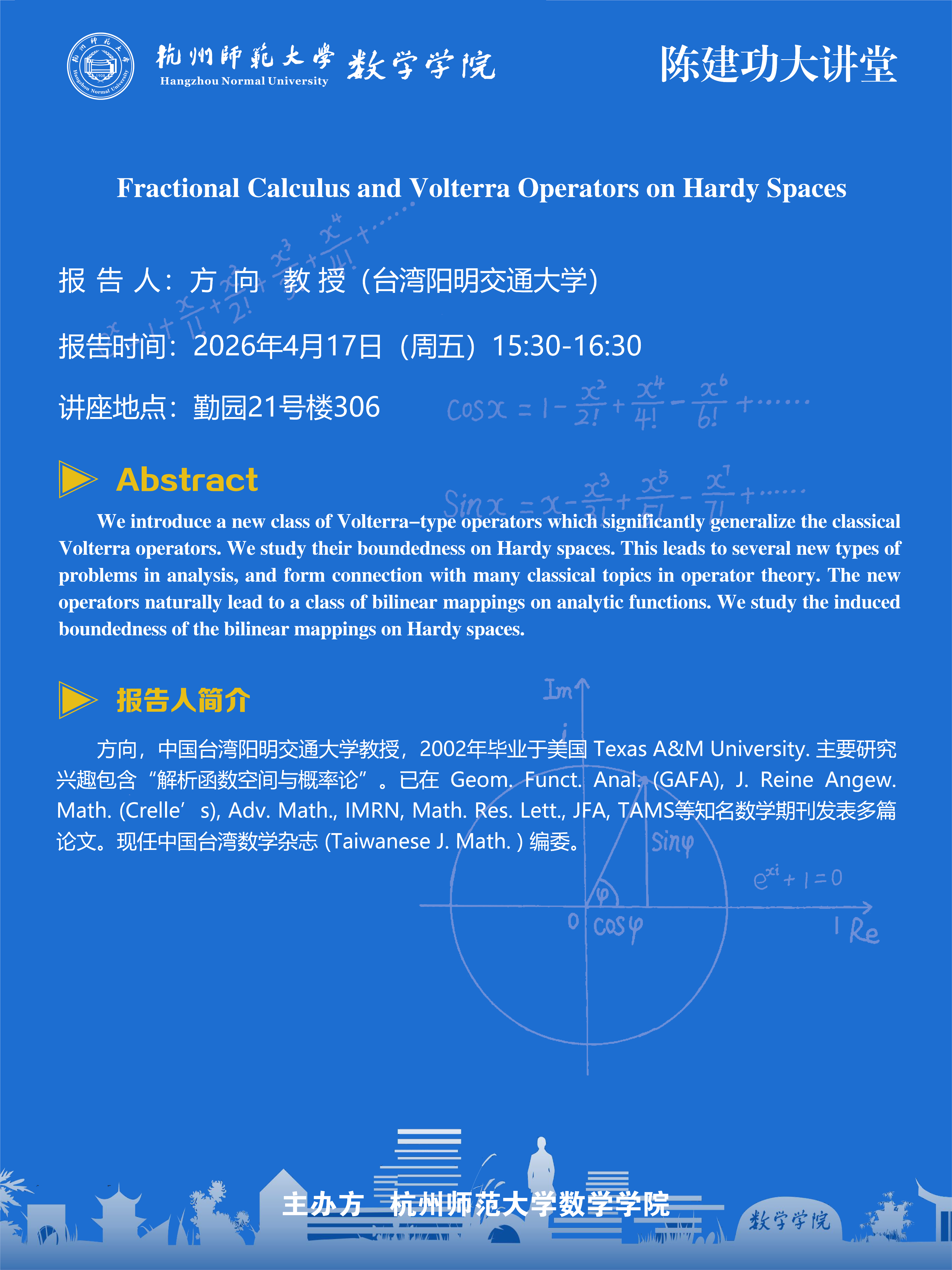 陈建功大讲堂(2026-12):Fractional Calculus and Volterra Operators on Hardy Spaces