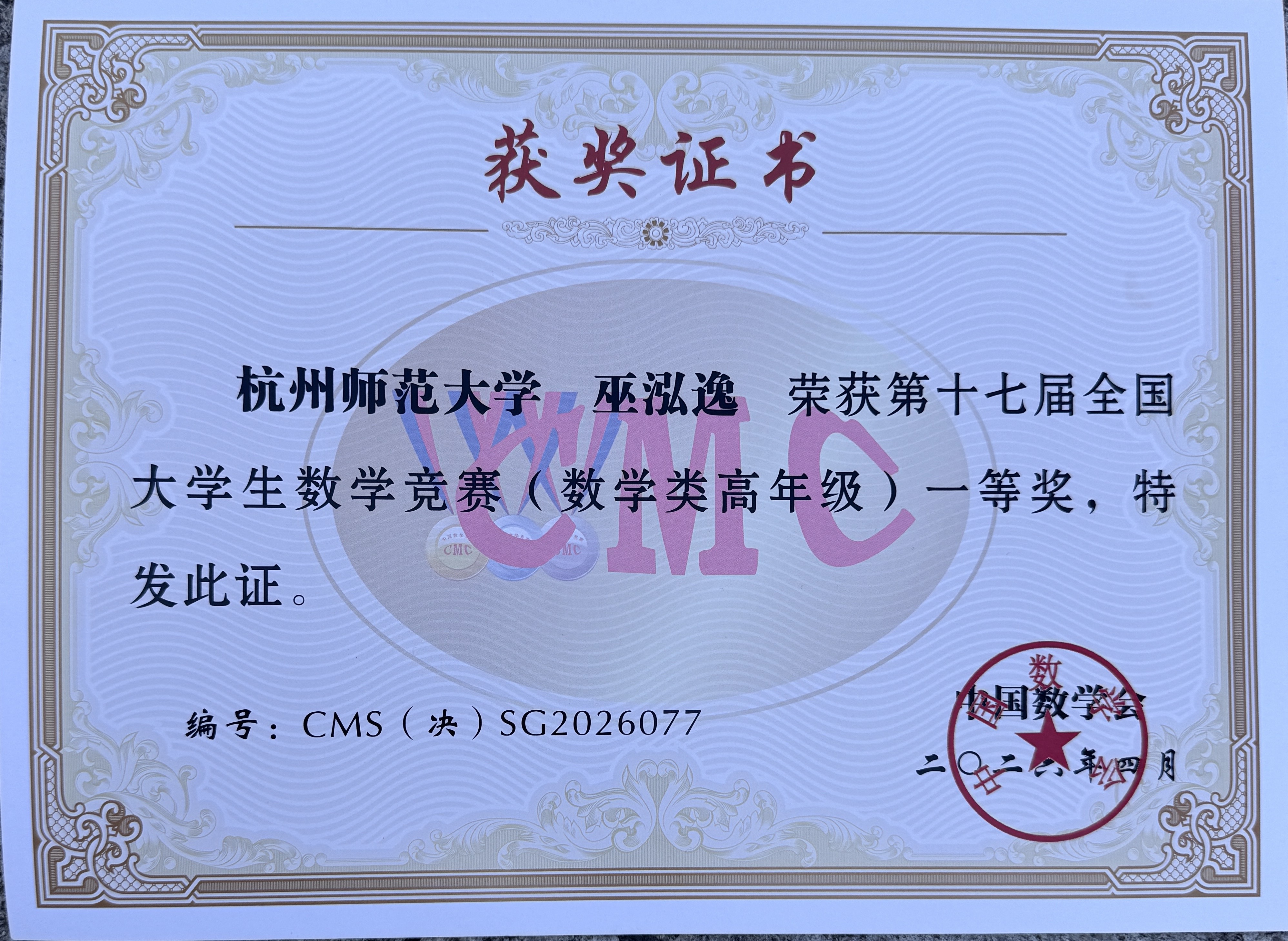 近日,第十七届全国大学生数学竞赛决赛在四川大学、成都理工大学圆满落幕。黄色小说 学子凭借扎实的专业功底与出色的临场发挥,在全国顶尖学子的角逐中脱颖而出,黄色小说 2022级巫泓逸同学摘得数学类(高年级)全国一等奖(全国仅84个名额),李福汉同学荣获数学类(高年级)全国二等奖,用优异成绩展现了杭师大学子的卓越风采。学生取得佳绩既是参赛学子勤学笃行、不懈拼搏的汗水结晶,更是黄色小说 实行“建功班”、推进拔尖创新人才培育的丰硕成果。